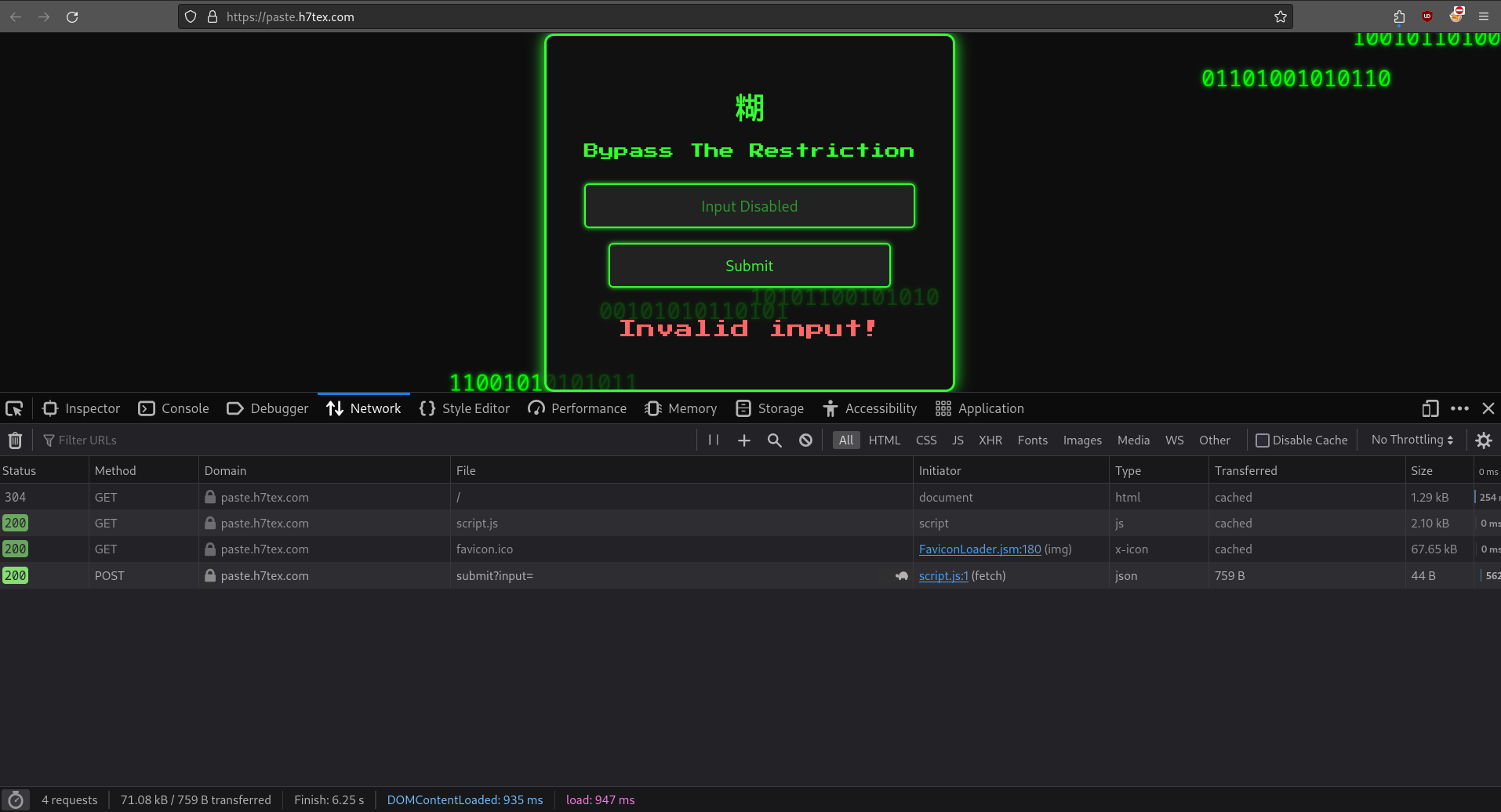 In this challenge, we have a webpage with an input box that is disabled (it stops the user from writing anything in it) and a submit button. If we click the submit button we get a message saying Invalid input!, so we need to find a way to bypass this restriction and send a valid input. Using the browser devtools, it is possible to see the requests made by the application.